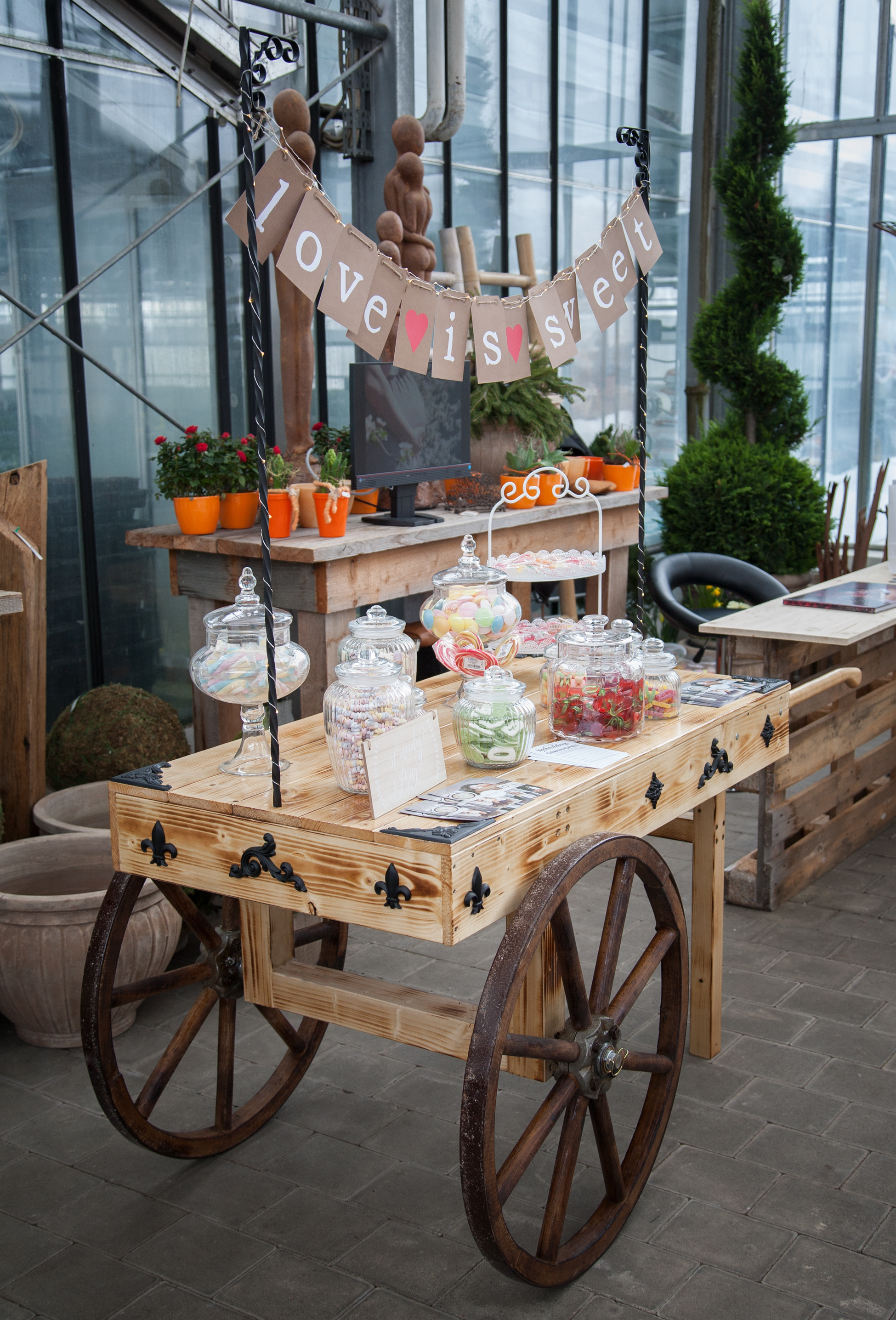 75,- € - Paket 3 (optional): Candy Bar Wagen mit Gläser, Schaufeln, Zangen, Girlande Bring- und Holservice, Auf-und Abbau.